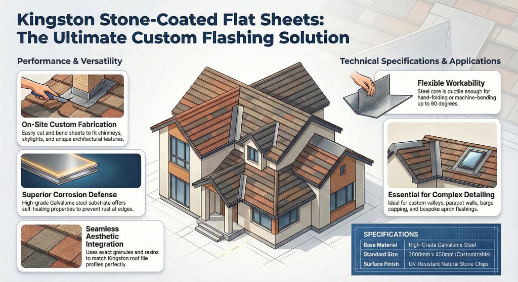 The Stone Coated Flat Sheet is the most versatile component in the Kingston roofing system. Unlike pre-molded accessories, this product is a raw Galvalume Steel Flat Sheet designed for on-site fabrication. It empowers professional installers to create custom flashings for complex roof details such as chimneys, skylights, parapet walls, and non-standard valleys. By using this flat stock, you ensure that every inch of the roof, no matter how intricate, maintains the same high-quality stone-coated finish as the main tiles.